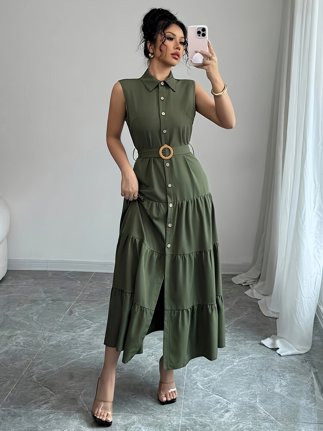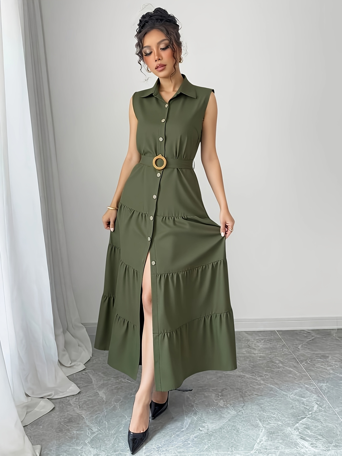 Embrace effortless chic with the Cairo Nights Geometric Print Dress. This sleeveless A-line silhouette features a sophisticated geometric print, a flattering V-neck, and a defining belted waist. Crafted from lightweight polyester, it’s the ideal piece for transitioning from casual daytime outings to semi-formal evening affairs. The tiered skirt adds a touch of playful movement, while the olive green hue exudes timeless elegance. Discover the perfect blend of comfort and style, ready to elevate your spring/summer wardrobe. Explore our collection for more stunning pieces. For the latest trends in geometric prints, see Vogue’s guide to the season’s hottest patterns.