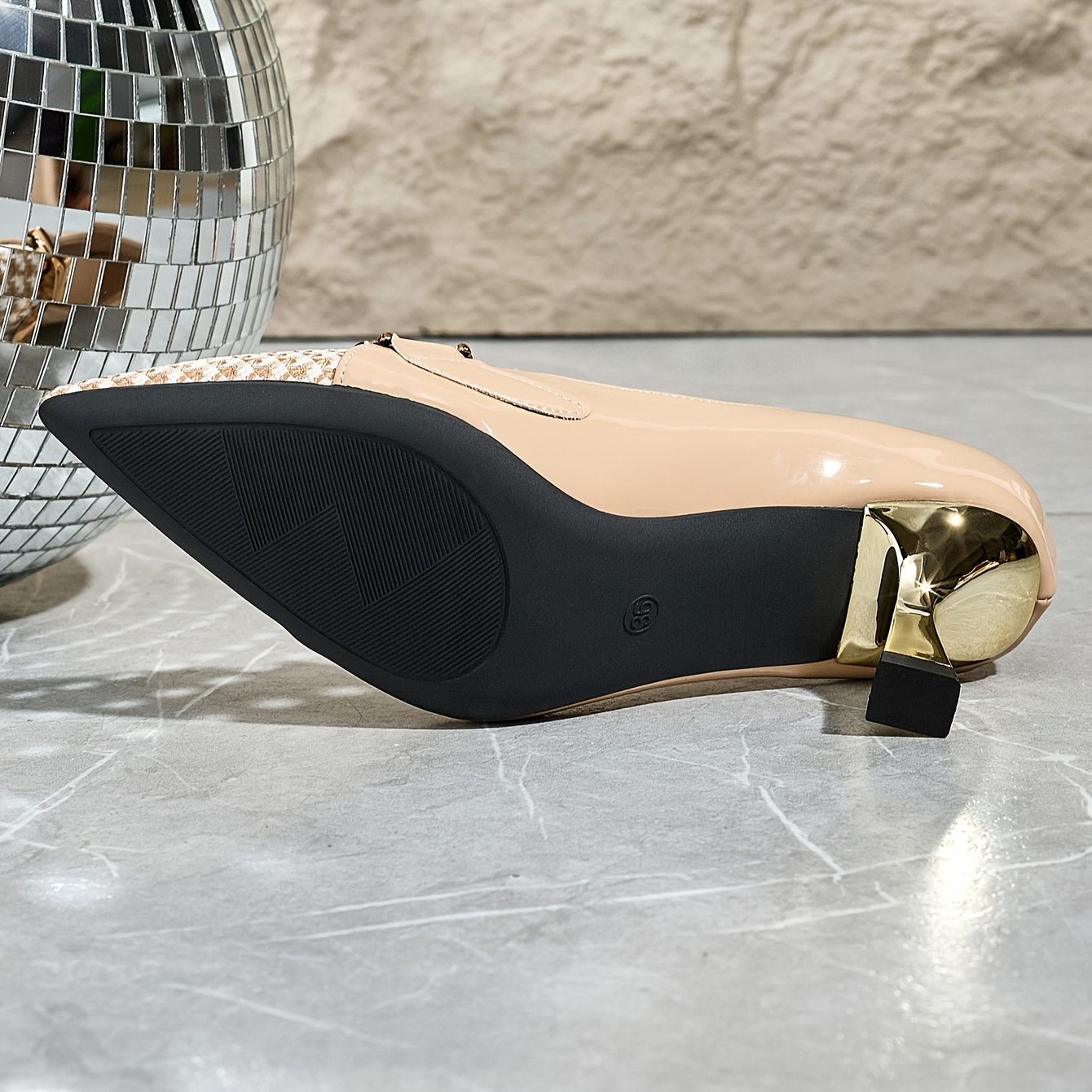 Step into the spotlight with the Houndstooth Chain Buckle Stilettos, a modern twist on a classic silhouette. These pointed-toe heels are designed for the fashion-forward individual who isn’t afraid to make a statement. The chic houndstooth pattern adds a touch of timeless elegance, while the gold chain buckle detail elevates the look to pure sophistication. Perfect for a night out, these stilettos will effortlessly take you from cocktails to dancing. Explore our collection of stunning footwear and discover your perfect pair. For more style inspiration, check out the latest trends on Vogue Runway.