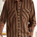 Men’s Casual Button-Up Shirt – Brown & beige color-block design, Lightweight Non-Stretch Fabric for Summer Office, Semi-Formal Events – Easy Care Everyday Blouse, Warm Weather Outfit, Textured Pattern, Breathable Material, Short Sleeve Top, Office Professionals