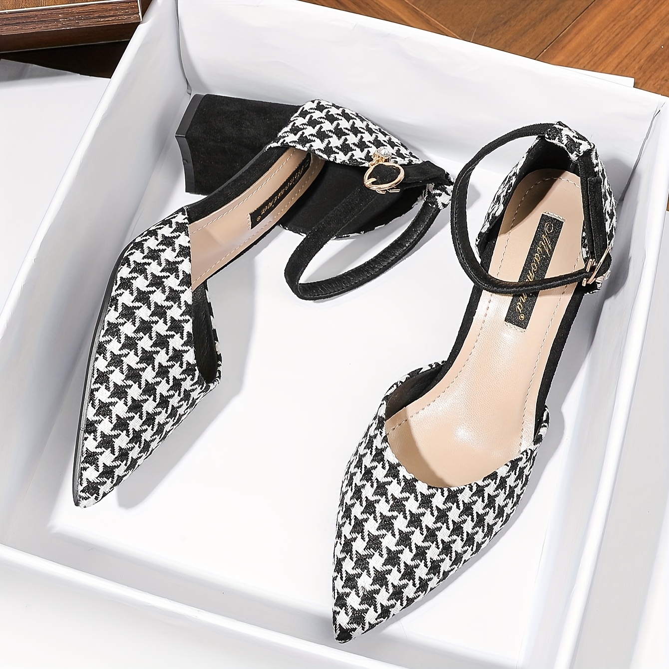 Introducing the Parisian Chic Houndstooth Block Heels, a perfect blend of classic French style and modern comfort. These elegant one-strap heels feature a sophisticated houndstooth pattern, making them an ideal choice for both professional settings and stylish outings. Designed for women who value both fashion and functionality, these heels offer all-day comfort, even during long hours of standing. Elevate your style and experience unparalleled comfort with these must-have heels. Explore our collection for more sophisticated footwear choices. For more style inspiration, check out the latest trends from Vogue Runway.