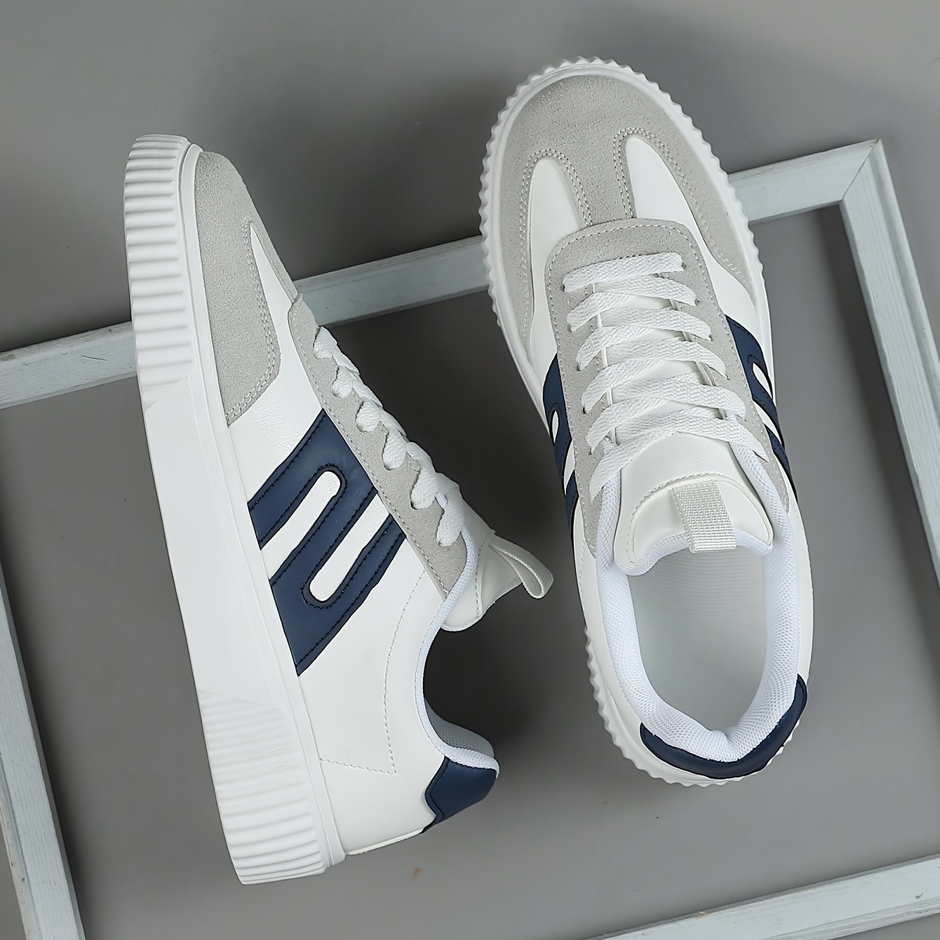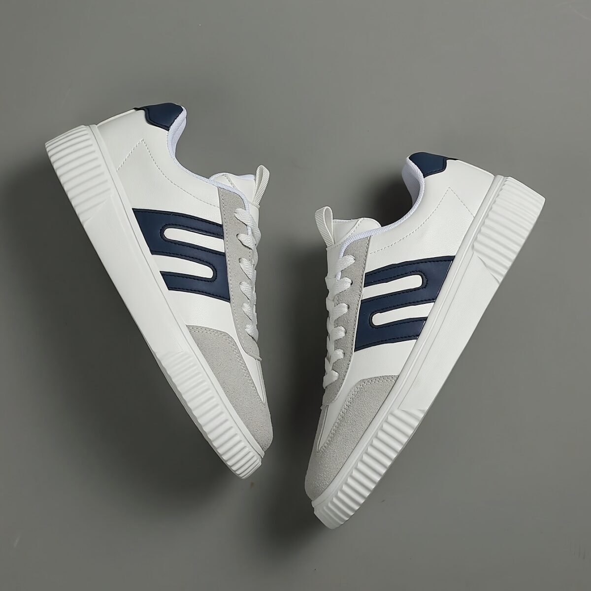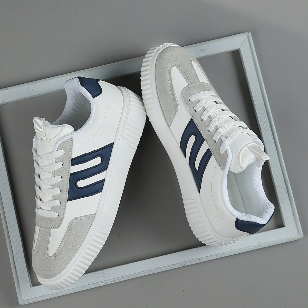 Men’s low-top sneakers are a versatile footwear choice for the modern man. These stylish sneakers offer a comfortable fit, perfect for everyday wear, running, or hitting the gym. Because of their cushioned EVA sole, they provide excellent support and impact absorption, making them ideal for active lifestyles. In addition, the breathable fabric lining keeps your feet cool and dry, while the durable traction outsole ensures a secure grip on any surface. You can explore our stunning collection for more options or check out Vogue’s latest trends. Furthermore, these men’s low-top sneakers boast a classic round toe and a minimalist design that complements any outfit. The combination of light grey and navy blue accents adds a touch of sophistication to these versatile shoes, therefore making them a must-have for any fashion-conscious individual. These men’s low-top sneakers are perfect for those who value both style and comfort. As a result of their meticulous design, these sneakers provide lasting comfort and support throughout the day, whether you’re running errands, working out, or simply relaxing. Men’s low-top sneakers offer a perfect blend of style, comfort, and durability. Their sporty design and breathable fabric lining make them ideal for an active lifestyle.