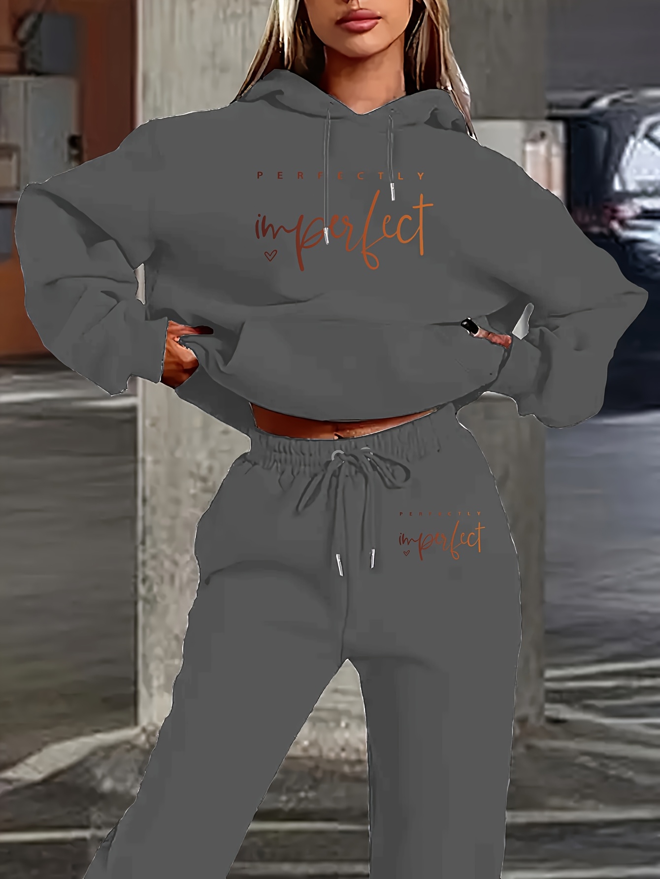 Indulge in the ultimate comfort and style with the “Perfectly Imperfect” Casual Loungewear Set. Crafted from a luxuriously soft knit fabric, this two-piece ensemble is perfect for embracing those cozy moments at home or adding a touch of laid-back chic to your weekend errands. The set features a trendy cropped hoodie with a kangaroo pocket and an adjustable drawstring, alongside matching drawstring pants for a coordinated look. The unique “Perfectly Imperfect” letter print adds a touch of personality to this versatile set, making it a must-have for your fall/winter wardrobe. Explore our collection for more sophisticated loungewear options. Stay updated on the latest loungewear trends from Vogue.